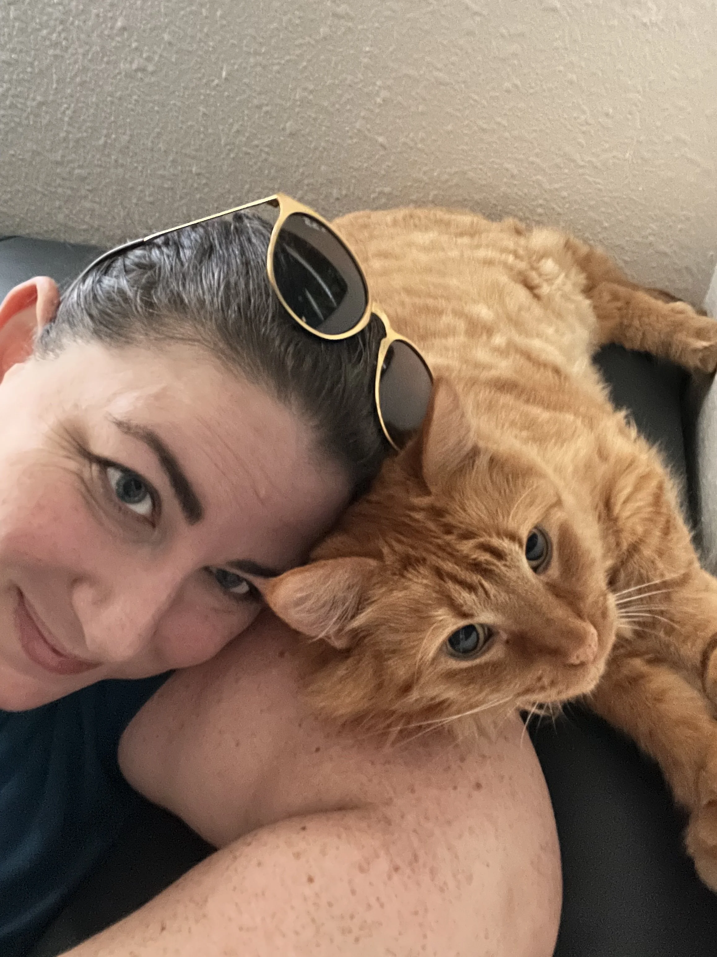 Not the only furry resident in the house, but the orangest, the largest, the longest companion, and the constant presence over her shoulder every stitch she stitches.